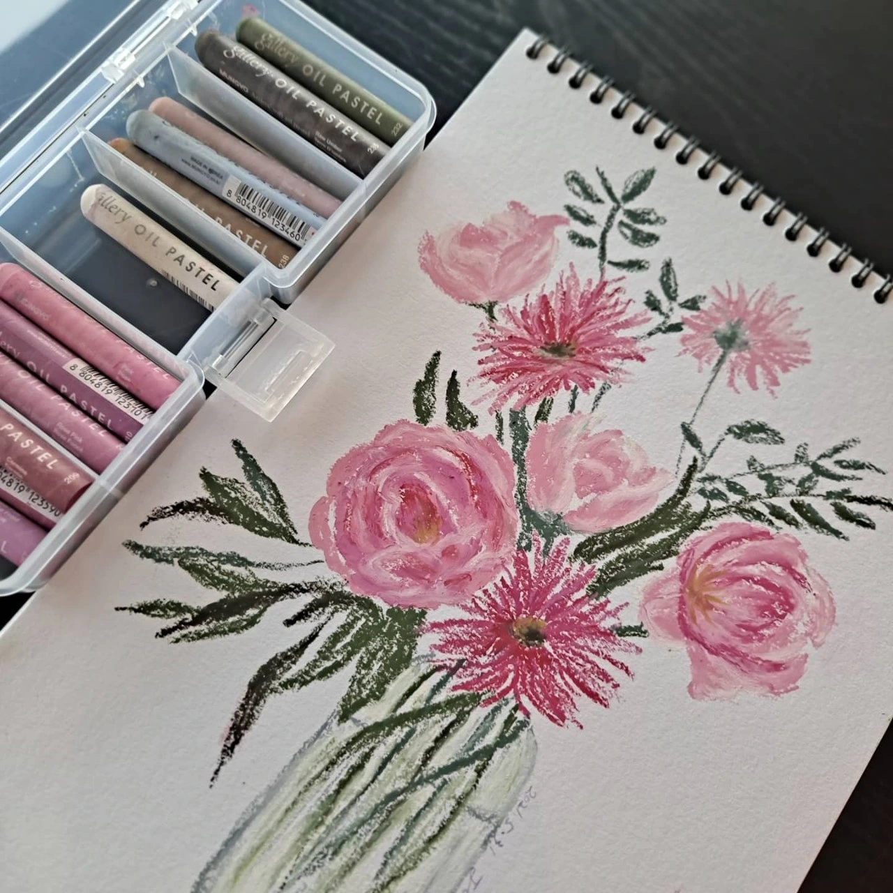 4개월 전부터 우연히 꽃그림을 그리게 되었습니다. 그것도 처음으로 만져보는 두툼한 소프트 오일 파스텔을 손에 들고 말입니다. 오일 파스텔은 어릴 적 추억을 떠올리게 하는 크레파스 그림과 비슷하면서도 좀 더 부드럽고 따뜻한 느낌을 줍니다. 제가 좋아하는 꽃그림을 하나씩 완성하다 보면 정말 뿌듯하답니다. 지금은 책 속의 그림을 따라 그리고 있지만 시간이 조금 지나면 제가 그리고 싶은 화병의 그림들을 마음껏 그릴 수 있는 날이 곧 올 것 같습니다. 오일 파스텔은 색을 덫칠하고 문질러 섞으면서 새로운 색상들이 탄생되는데, 손가락으로 강도를 조절해 방향까지도 조심해서 완성해야 합니다. 좀 더 섬세한 마무리를 위해서는 면봉과 색연필을 사용한답니다.