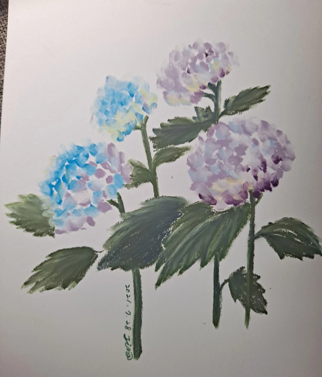 저는 특히나 장미와 수국을 좋아합니다. 한 송이만 있어도 화려하고 충분한 자태가 좋아 장미를 선호합니다. 장미꽃 한 송이를 구입해 작은 화병에 자주 꽂아두기도 합니다. 여름날 수국은 작은 꽃들의 조합이 너무나 풍성해서 좋아합니다. 특히나 파스텔 톤의 푸른 수국은 보기만 해도 시원해집니다. 장미와 수국을 그림으로 그리다 보면 좋아하는 꽃 한 송이를 피워내는 기분이랍니다. 다양한 재료들로 제가 좋아하는 꽃들을 그려내는 일은 너무나 뿌듯하고 즐겁습니다.