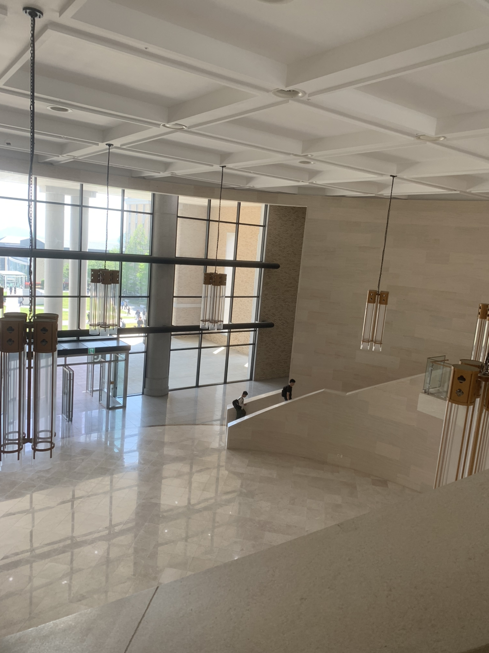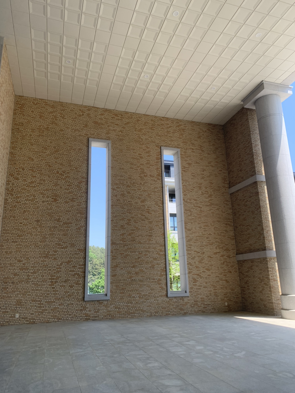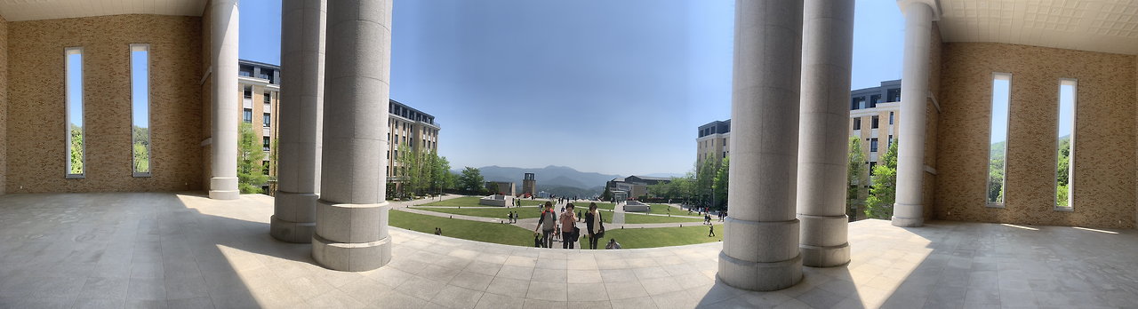 건물 이름은 잘 모르지만, 중앙광장의 맨 위에 자리 잡은 건물은 들어가자마자 홀의 웅장함에 탄성이 나왔다. 국내에서 둘러보았던 모든 대학 중에 건축이 가장 아름다운 캠퍼스였다. 코펜하겐에서 둘러보았던 시립도서관의 웅장함을 떠올리게 하는 실내구조였다. 건물 외벽에는 마치 한 쌍의 액자처럼 바깥의 풀숲을 담는 사각형의 여백이 만들어져 있다.