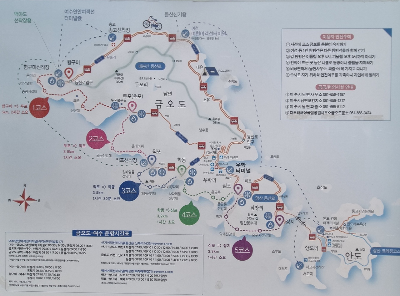 (참고 : 금오도에 배가 도착하면 여천항 여객터미널에 있는 안내원들로부터 각 코스에 대한 여러 가지 궁금한 사항들을 안내받을 수 있다.)
