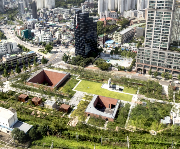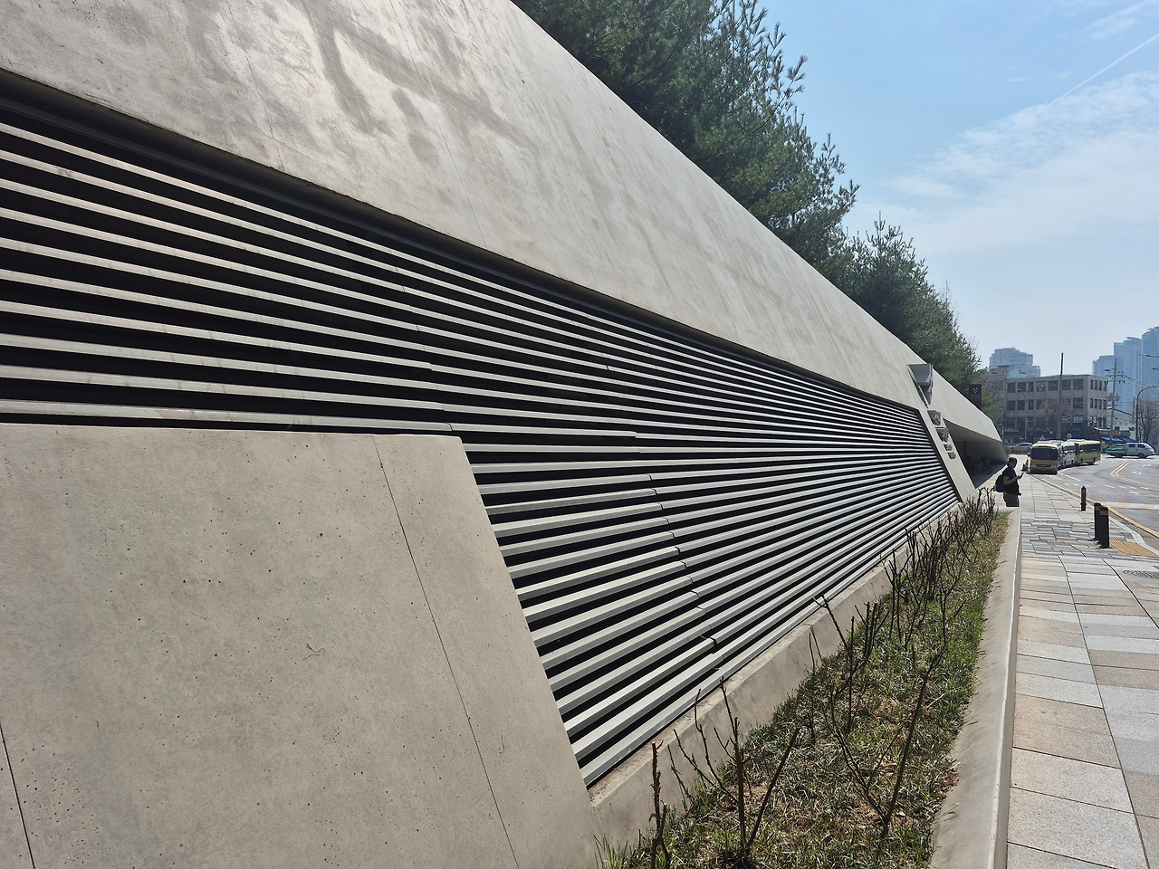 가령 높이가 공원보다 낮은 이면도로 쪽에 노출된 건물의 외벽을 건축가는 비스듬하게 눕혀 놓았다.