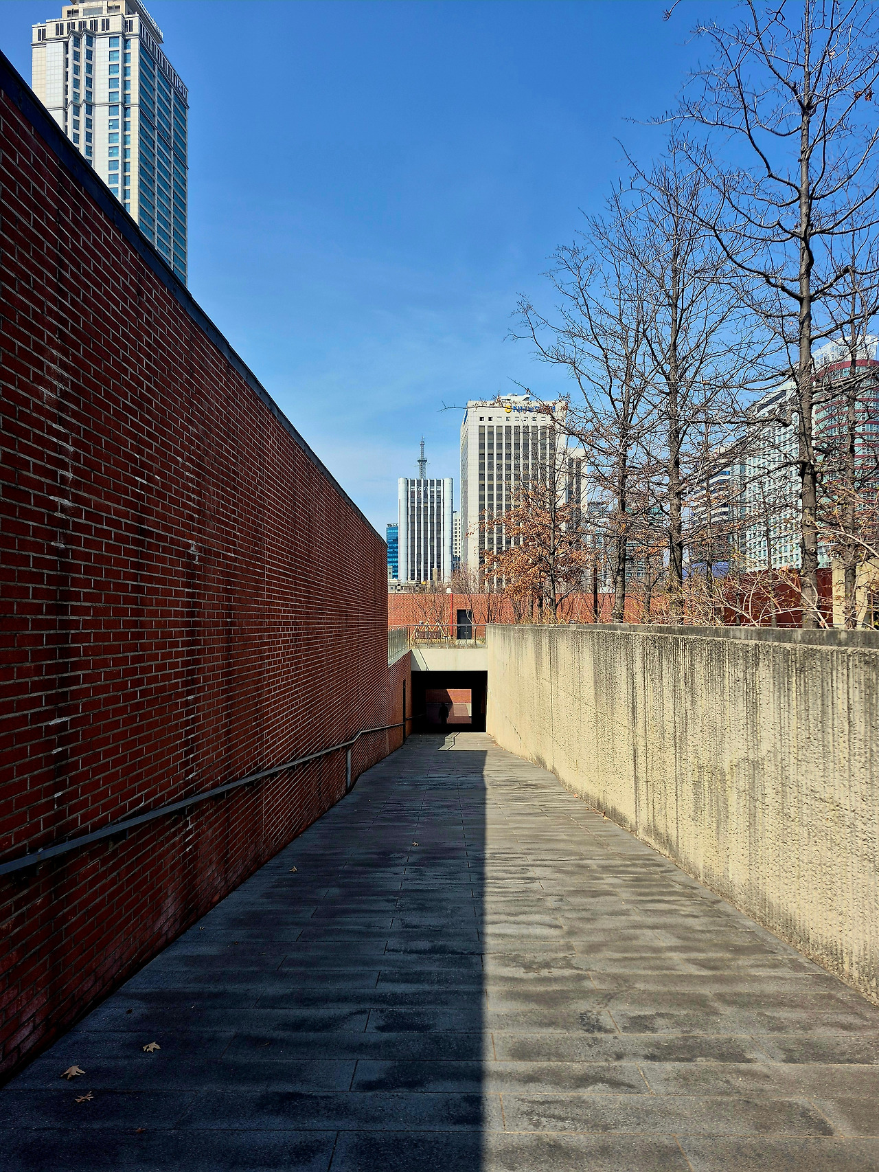 모든 공간이 지하에 들어가 있으니 땅 위에는 붉은 벽 몇 개뿐 , 나를 지나치지 말고 봐달라고 소리치는 물체가 없다. 건축가가 만든 풍경은 아니지만, 사람 없는 지상의 공원도 평범하기 그지없다.