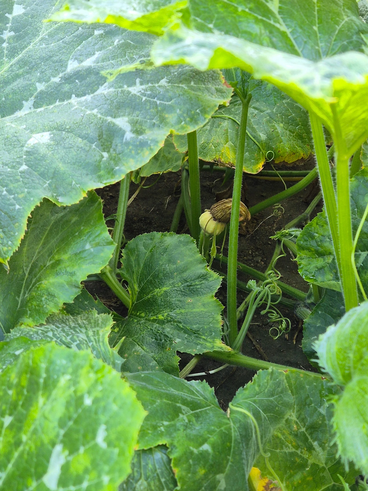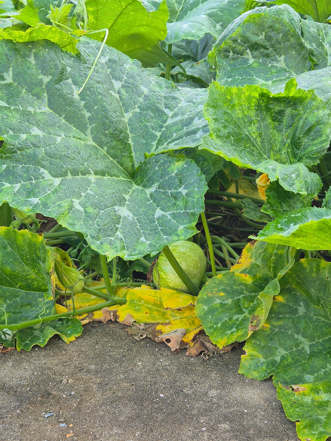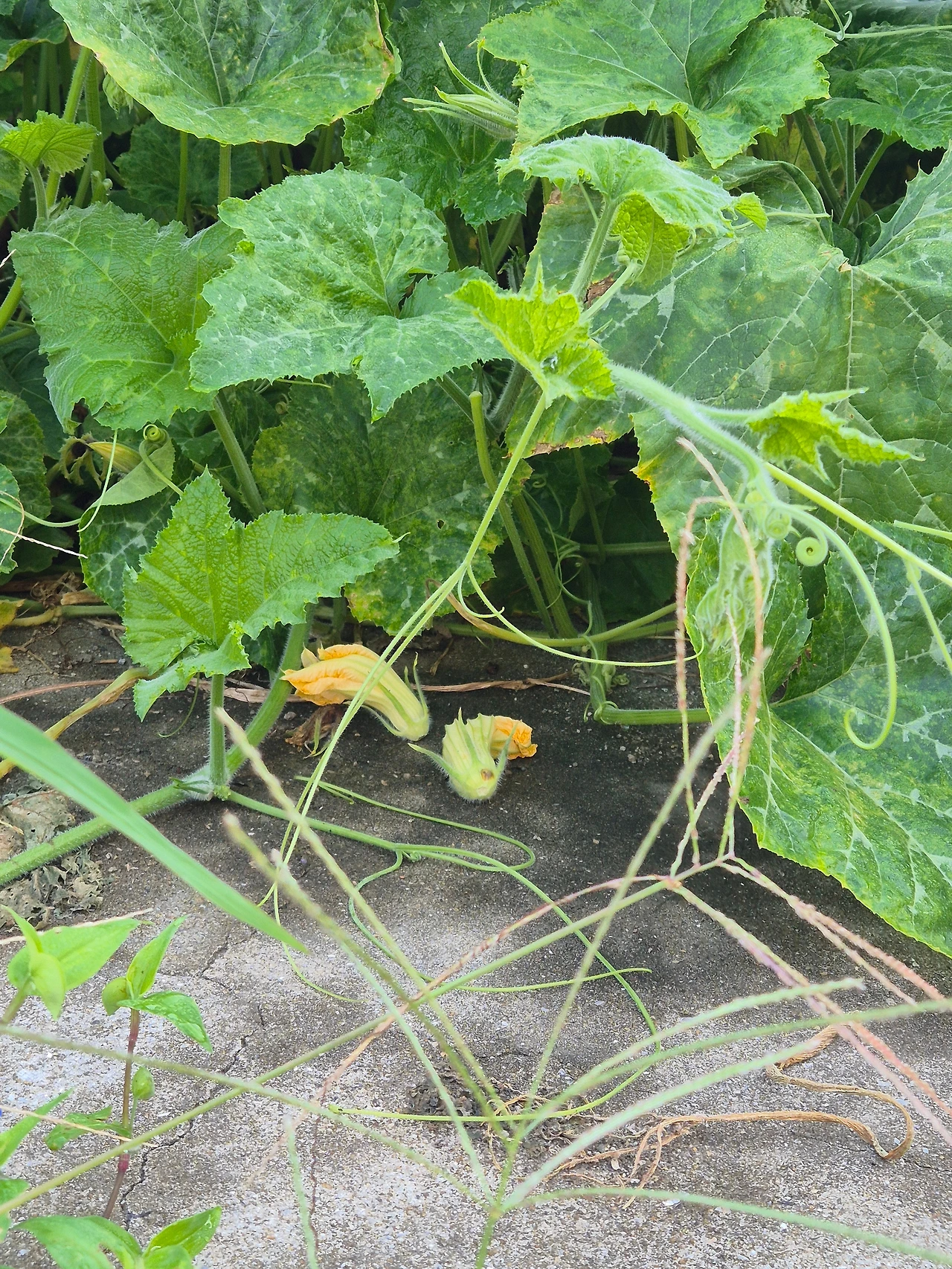 삭막한 모텔촌 구석에 자리 잡은 호박덩굴. 더위에 축축 늘어져 시들시들한 날은 애처로웠다가 다음날 새벽이슬에 쌩쌩하니 살아나면 기특했다가, 그렇게 올여름 호박 덩굴과 호박꽃은 그 구역을 밝혀주었다. 한 동안 수꽃만 피고 암꽃이 피지 않아 내 속을 태우더니만, 어느 날 꽃 아래로 손톱만 한 아기 호박이 보였고, 하루 이틀 무럭무럭 영글어 가는 것이 보여 내 맘을 흡족하게 했다. 내 땅도 내 호박도 아닌데.