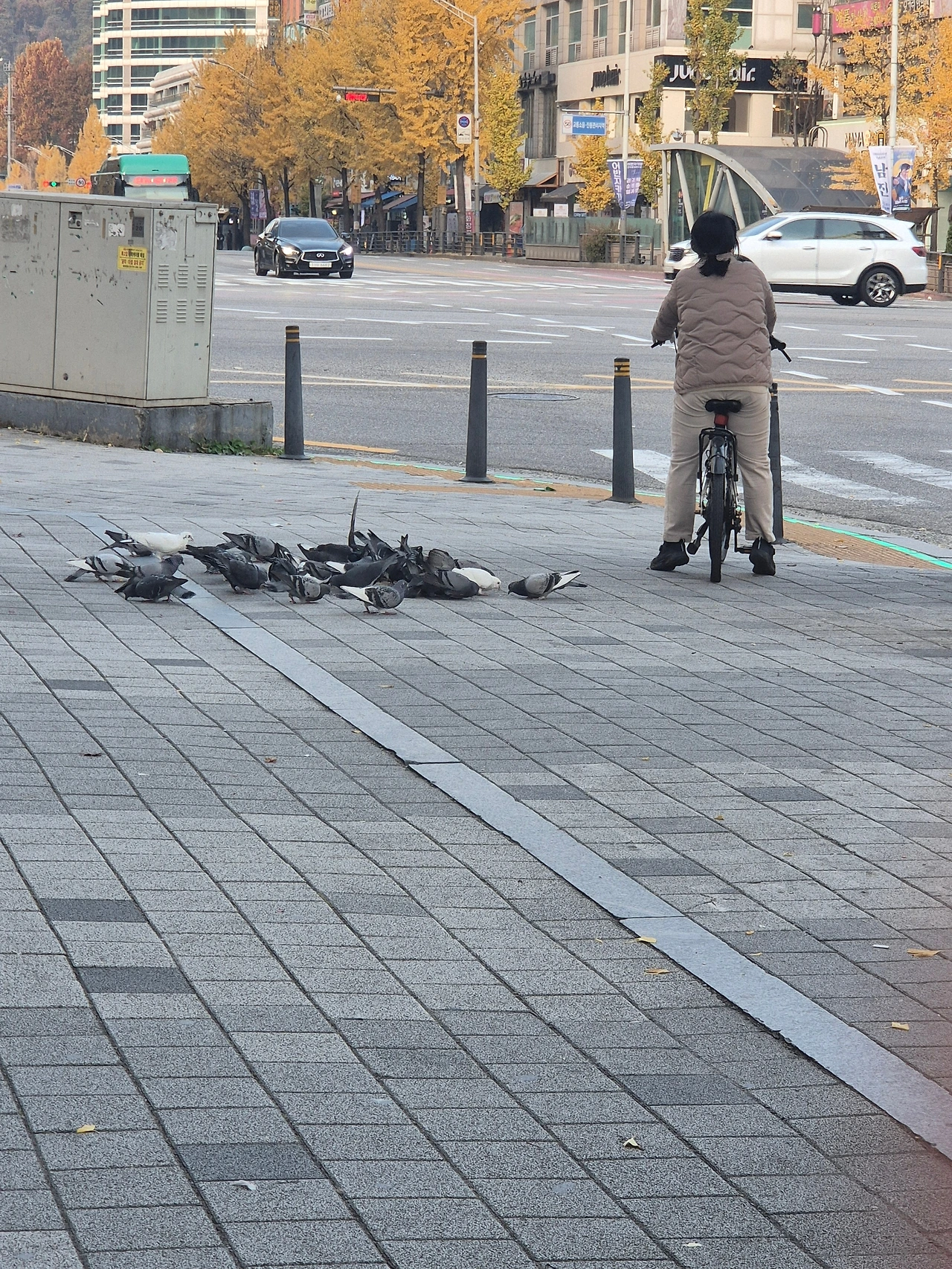 아마도 주기적으로 비둘기들을 챙기시는 대모님인가 봅니다. 저 자전거로 어디까지, 어느 동네까지 달리시며 모이를 주고 계실까요? 지자체에서도 하지 말라는 일을 용감하게 실천하고 계신 비둘기 대모님이 대단하시다 싶고 존경스러워도 졌습니다. 저는 새를 사랑하지만 사람들의 지적이나 비난은 못 견딜 것 같거든요.
