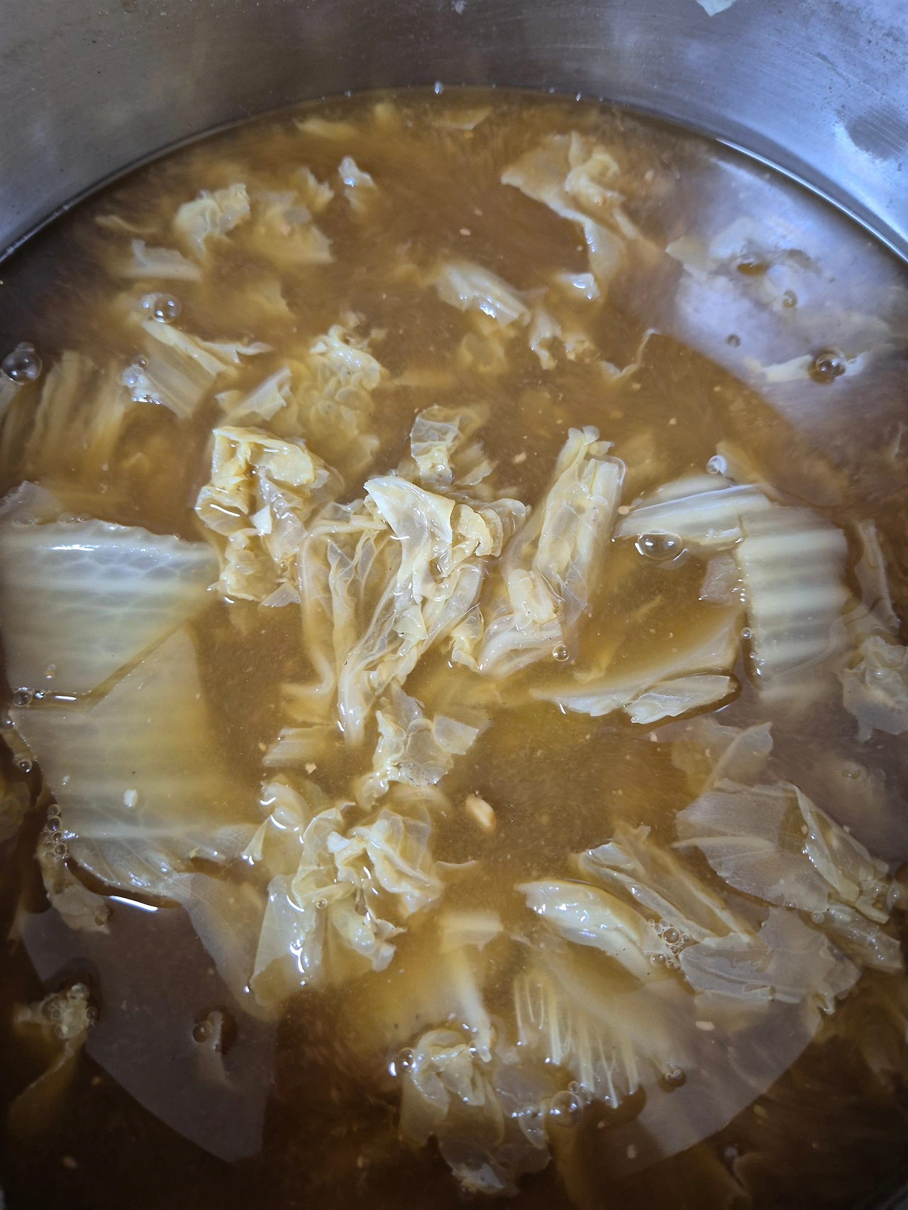 나는 국에 빠진 멸치를 싫어하는 남편 덕분에 손쉬운 마법의 알약 두 알을 넣고 배추를 손으로 죽죽 찢어 넣었다.