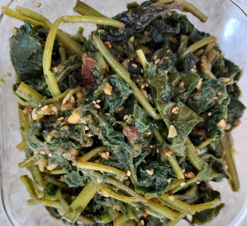 쓴 맛이 많이 달아나지 않았으면 해서 데친 후 물에 잠시만 담가 둔 후 쑹덩쑹덩 먹기 좋은 크기로 자른 뒤 팬에 들기름을 넉넉히 두르고 집간장과 다진 마늘과 파를 넣고 볶아 주다가 마지막으로 들깨가루를 솔솔 뿌려 가볍게 버무렸고 데친 참나물엔 된장 양념을 해서 무쳐 보았다.