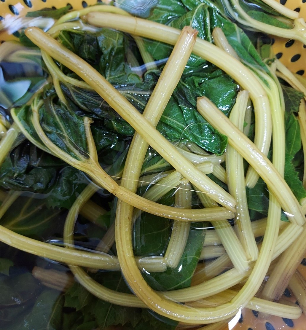 데친 머위집으로 돌아와 손질을 끝낸 머위로 할머니가 해주시던 요리법 대로 볶아 보았다.