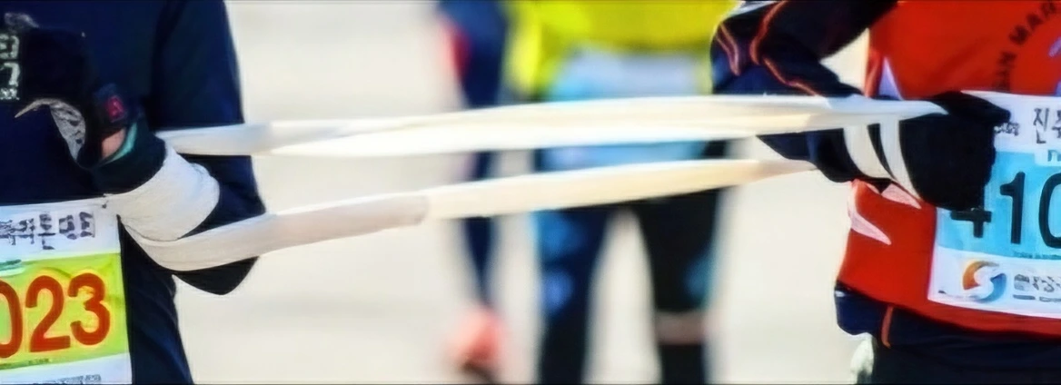 시각장애인이 마라톤을 하기 위해서는 '가이드 러너'가 꼭 필요한데 아래 사진처럼 팔목이나 팔꿈치에 끈을 연결해 함께 달린다.