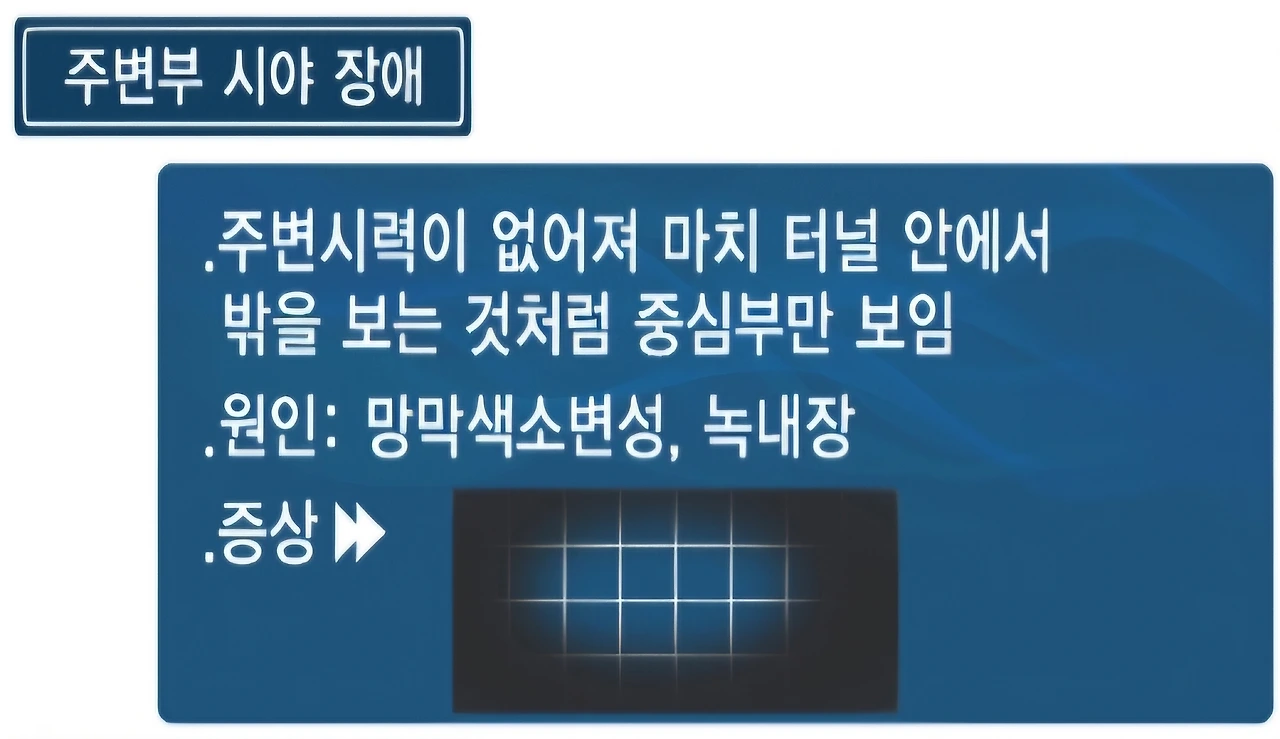 보통 유전적 질환인 망막색소변성증(RP)이 터널식 시야를 갖는 경우가 많은데 자신이 그런 유전인자가 있는지도 모르고 수십 년을 살다 발병이 되어 상황을 받아들이기 힘들어하는 경우가 많다.
