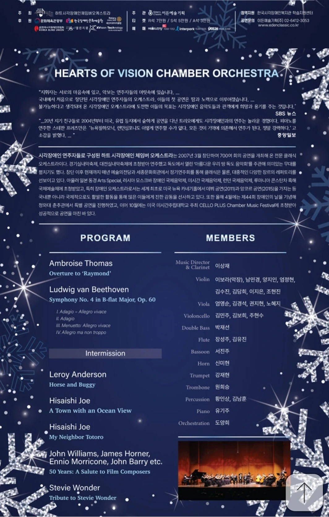 진정한 오케스트라의 면모를 충분히 보여줄 만한 곡으로서 그에 더해 시각장애인 단원 한 사람 한 사람의 인생 서사를 상상하며 곡에 대입시켜 감상한다면 결코 지루하지만은 않을 것이다. 충분한 공감과 교감이 이루어지리라 감히 예측해 본다.