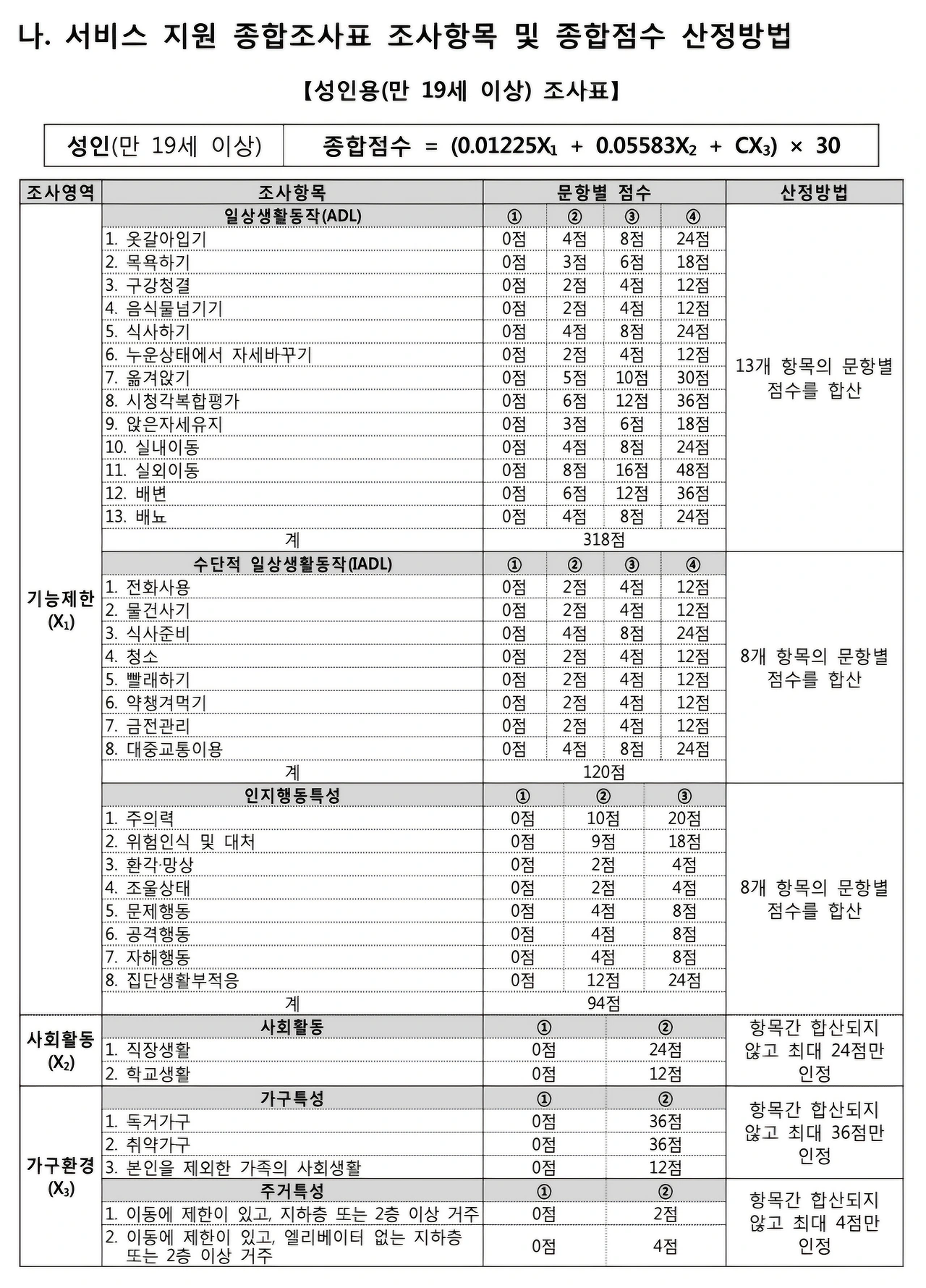 실제는 아래 사진처럼 표제화 되어있지만 글을 직접 읽을 수 없는 시각장애인을 위해 구어체로 직접 묻는 것인데 시각장애인에 대한 이해도가 부족하니 단순히 혼자서 밥을 먹을 수 있는지, 걸어다닐 수 있는지 등 지체와 뇌병변에 해당하는 질문을 하고, 조사표를 볼 수 없는 시각장애인은 직원이 묻는대로 대답하며 그에 따라 점수 산정이 된다.