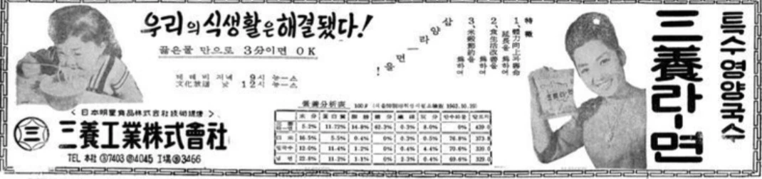 당시 미군 구호품으로 밀가루가 많았기에 이를 국수로 만들어 기름에 튀겨낸 뒤 수분을 증발시켜 지금과 같은 형태로 만들어졌으며 처음에는 면 자체에 스프를 버무려 생산되었단다.