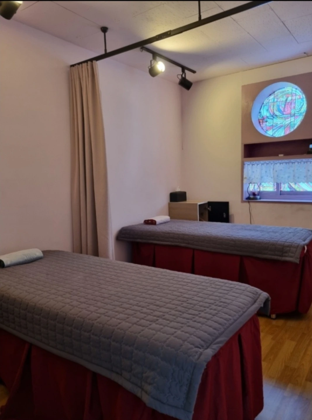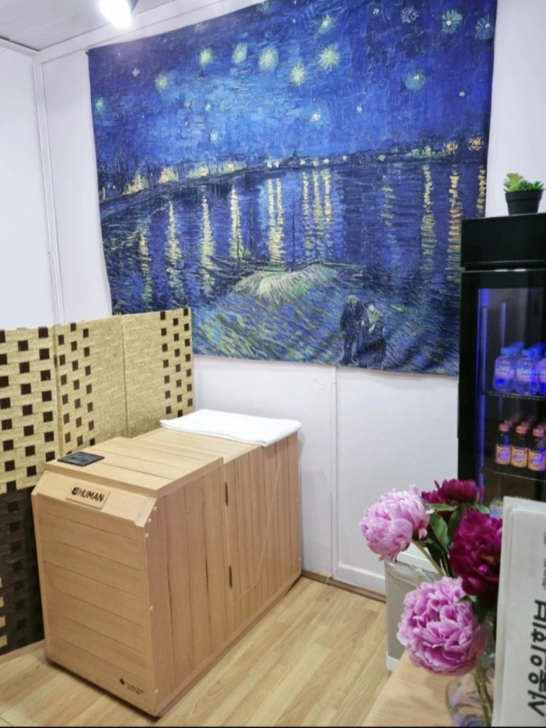 배선함과 옆 사무실 문짝을 가리는데 필요한 가림막은 내가 좋아하는 고흐의 작품들을 사다 꼭꼬핀으로 고정하고, 침대를 새것 같은 중고로 네개를 들여 두개의 방에 나누어 설치했다.
