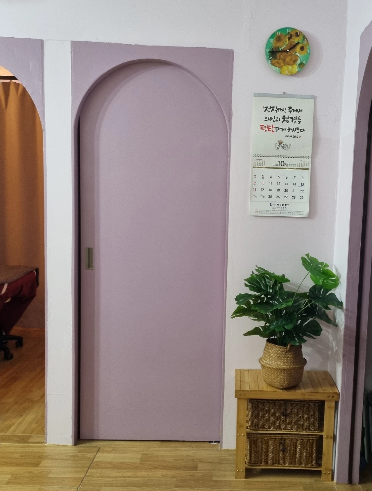 "엄마 보라색 좋아하잖아.... 나도 엄마처럼 보라색 좋아하고... 그러니까 벽은 연보라색으로 칠하고, 문이랑 창문 이런 데는 좀 더 진한 보라색으로 칠하는 게 좋을 것 같은데?"