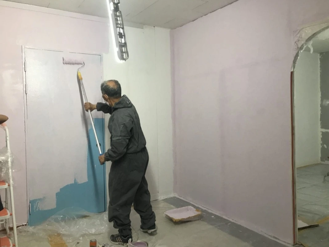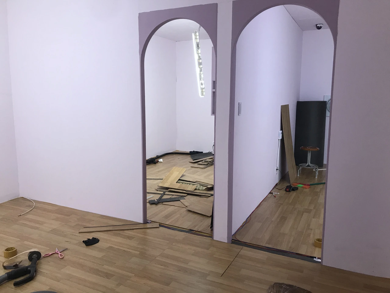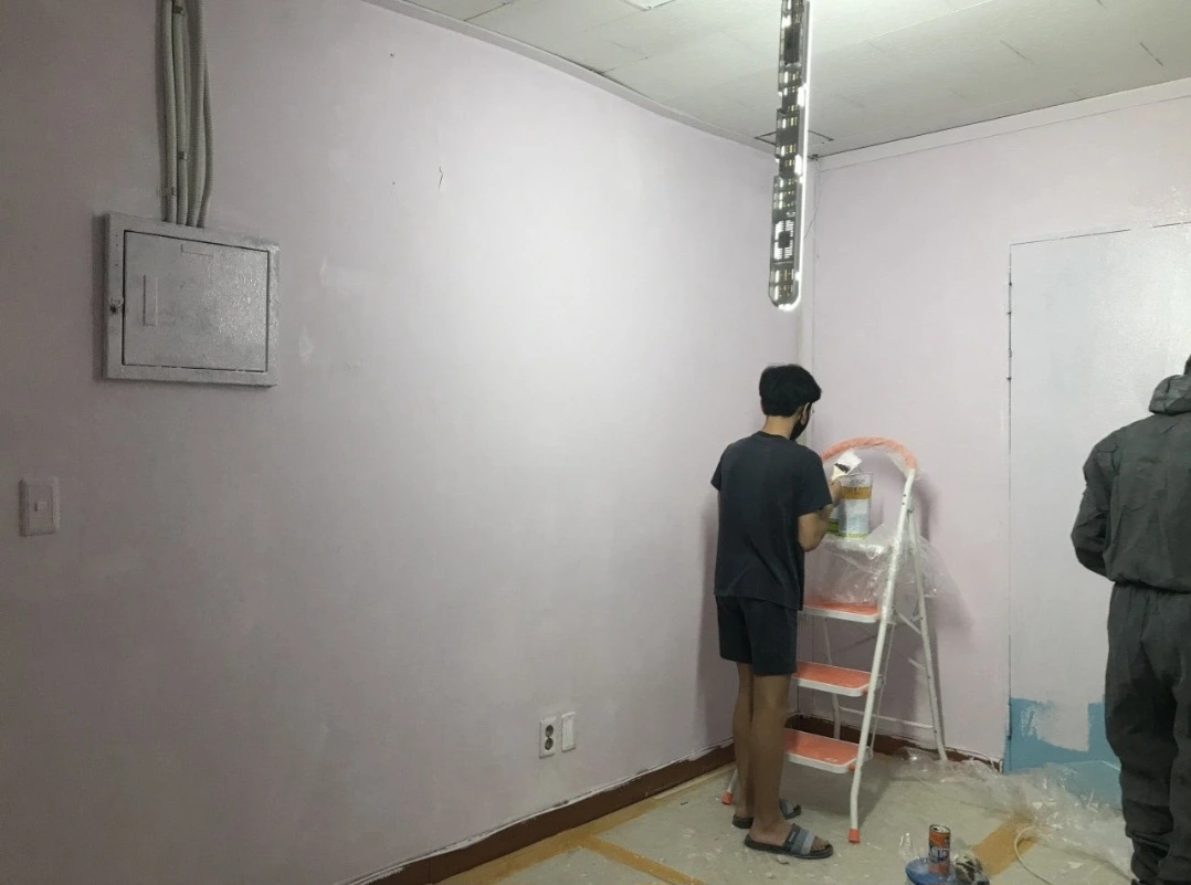 그에 앞서 바닥에 모두 보양재를 깔아놓고 테이프로 마무리 한 채, 가벽에 난 수백 개의 타카 구멍, 크랙들을 메꾸는 퍼티 작업을 하기 위해 온갖 재료를 구매해서 물에 개어 바르고 펴고 하기를 2~3일에 걸쳐 작업했다.