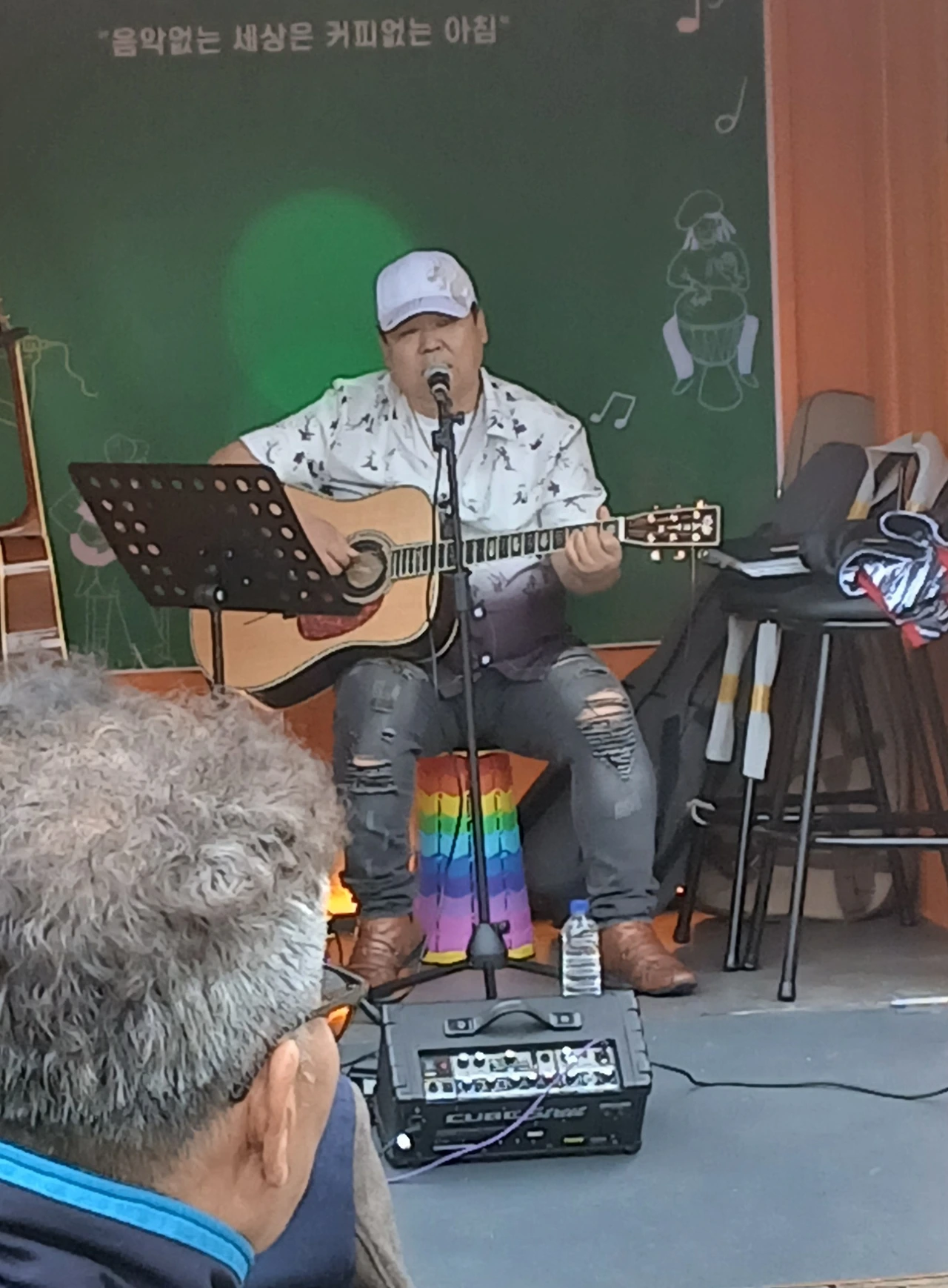숍인숍 행사에 참여하는 카페들을 방문하던 중 멀리서 애잔한 노래가 들려왔다. 버스킹이 시작된 듯했다. 끄물끄물한 날씨에 비까지 내린 우중충한 거리에 잔잔히 울려 퍼지는 낮은 음색의 진중한 노래는 35년 전 미국으로 떠나기 전, 좋아하던 포크송 가수 김광석을 떠오르게 했다. 영락없는 김광석이었다. 갑자기 가슴이 먹먹해졌다. 카페 갤러리 둘러보기는 뒤로 미루고 버스킹 무대를 찾아 서둘러 발걸음을 옮겼다.