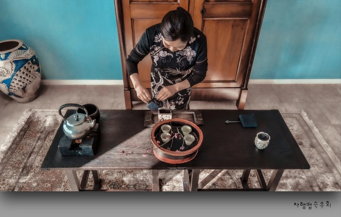 華足安行화족 안행꽃을 곁에 두고 차를 따른다.