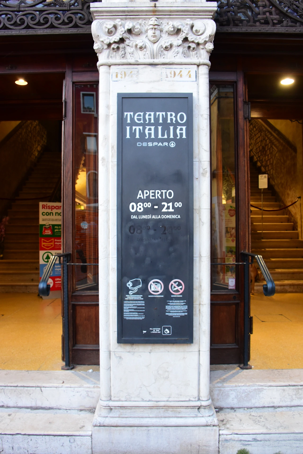 테아트로 이탈리아는 1916년에 짓기 시작하여 2년간의 공사 끝에 완공되었다. 건물의 설계는 1915년 건축가 조반니 사르디(Giovanni Sardi)가 했다고 하지만 그는 1913년에 요산혈증(Uricemia)으로 갑자기 사망했다. 테아트로 이탈리아는 원래 시네마 극장으로 지었으며 1970년대 말까지 운영되었다. 그후 카 포스카리 베네치아 대학교에서 인수하여 회의장으로 사용했으나 한동안 방치되었고, 1990년대 말에 코인 가문에서 매입하여 내부 리모델링 공사를 거쳐 2016년 말 슈퍼마켓으로 문을 열었다. 이때부터 테아트로 이탈리아는 사유 재산이 되었다.
