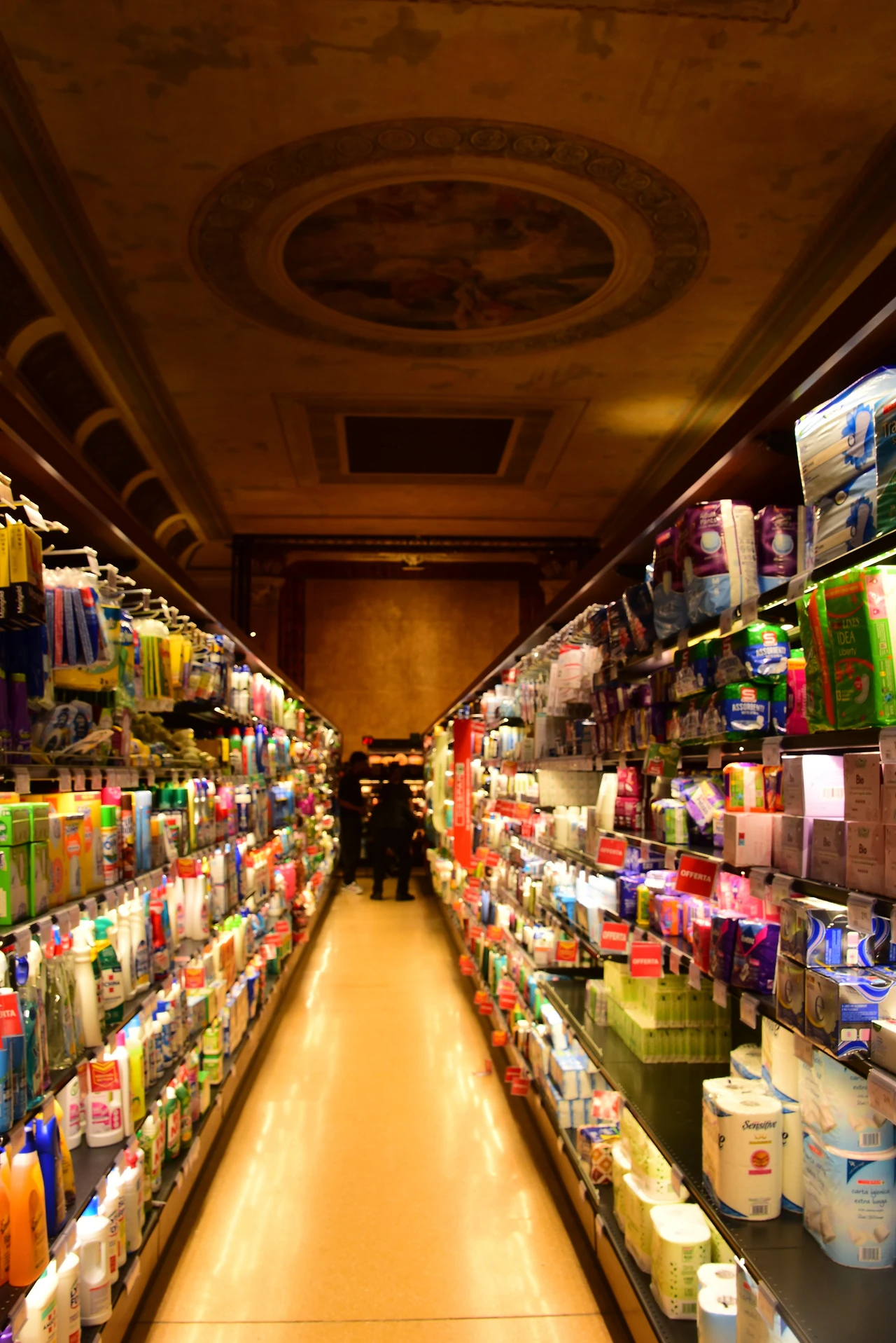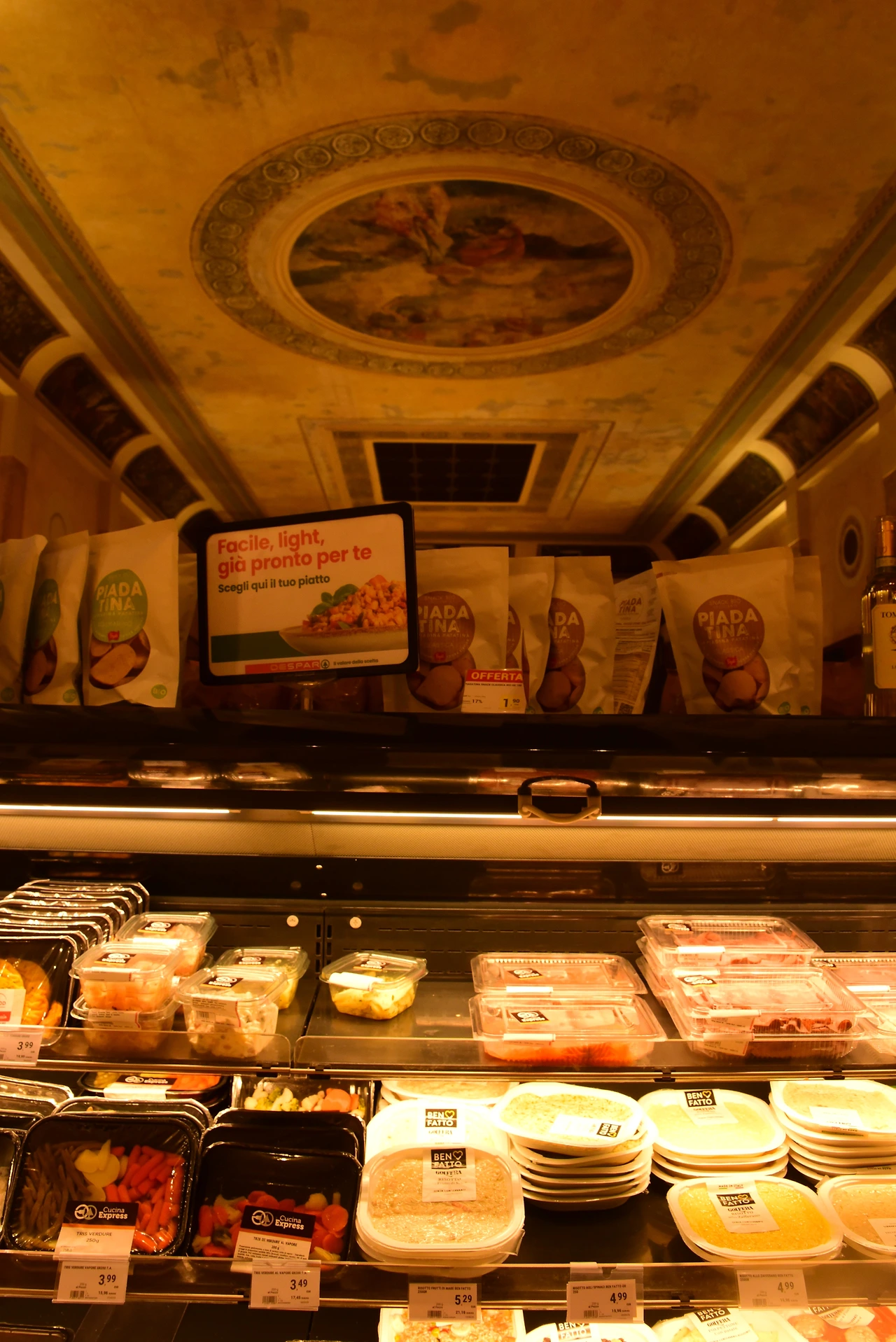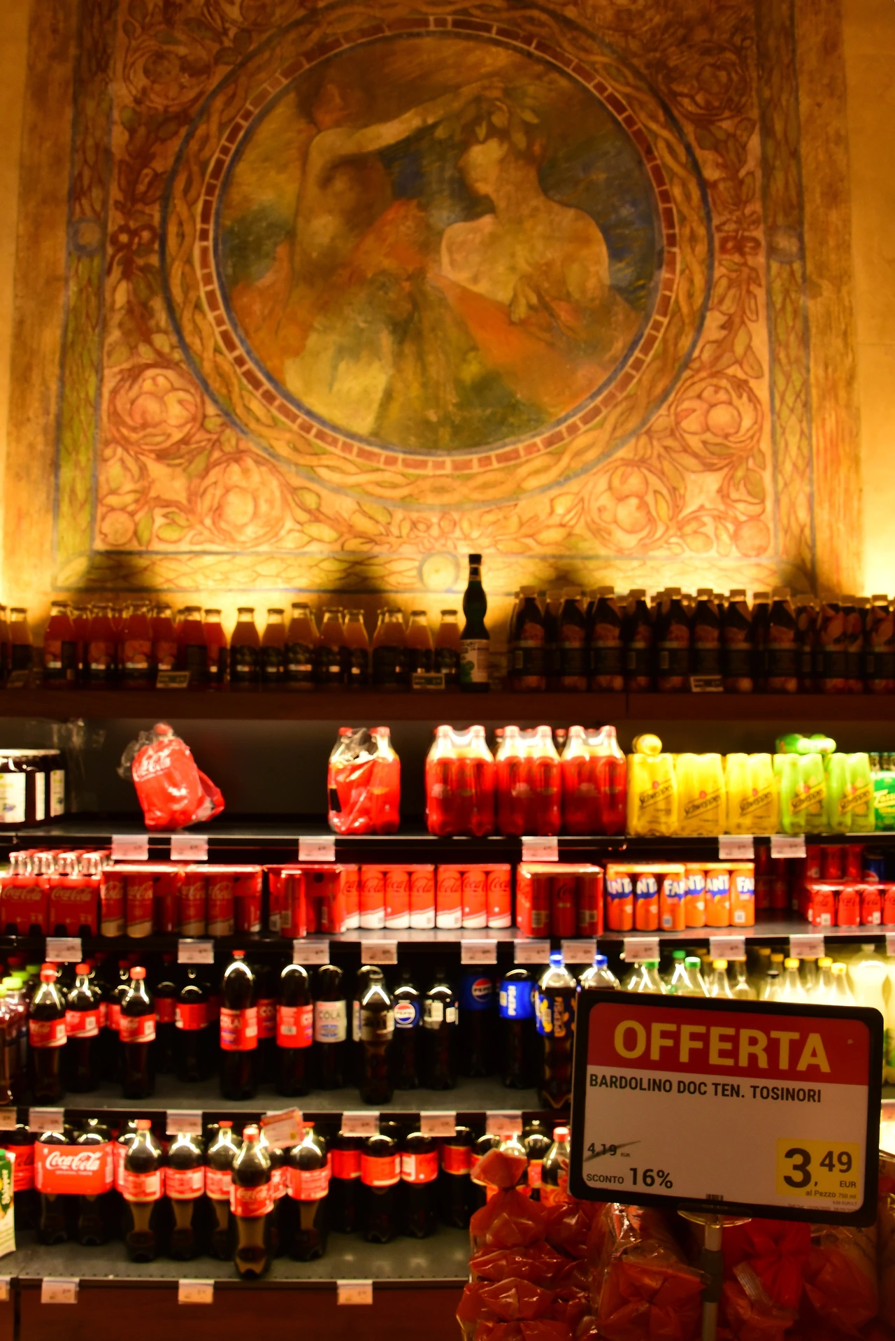 안은 밖에서 보는 모습과 완전히 다르다. '슈퍼마켓이야 미술관이야?' 하고 반문할 정도로 무척 이색적인 풍경이다. 벽과 천장에 그려진 프레스코화들이 예술을 모르는 내가 보아도 범상치 않다. 벽의 그림은 귀도 마루시그(Guido Marussig, 1885~1972)가 그렸고, 천장에는 알레산드로 포미(Alessandro Pomi, 1890~1976)가 그린 '이탈리아의 영광'(Gloria d’Italia)이 있다. 두 사람 모두 이탈리아 현대 화가다. 또한 건물 내부에는 베네치아의 철과 유리 장인이었던 움베르토 벨로토(Umberto Bellotto, 1882~1940)가 설치한 장식품들도 여럿 볼 수 있다. 그 당시에만 해도 유명한 예술가들을 불러 모아 꾸밀 정도였으니 사유 재산이었다면 엄두도 못낼 대단한 건물이라 하겠다.