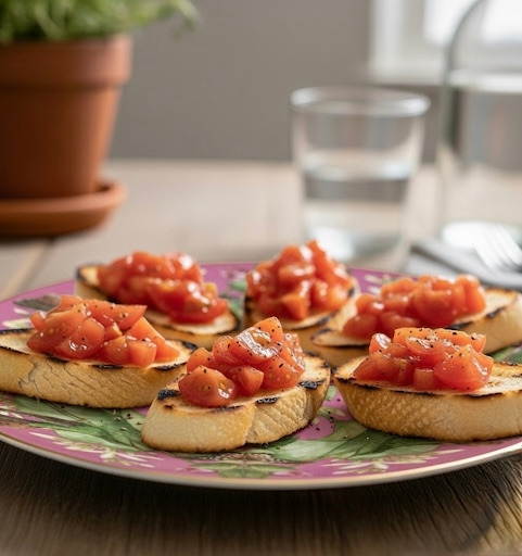 3. 바게트 위에 토마토·바질을 올리고, 남은 오일을 살짝 두른 뒤 후추와 (선택) 발사믹으로 마무리.