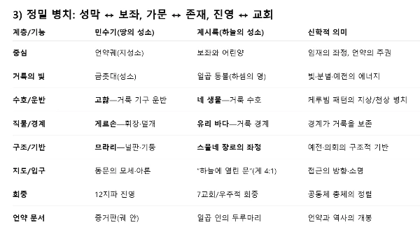 3) 정밀 병치: 성막 ↔ 보좌, 가문 ↔ 존재, 진영 ↔ 교회