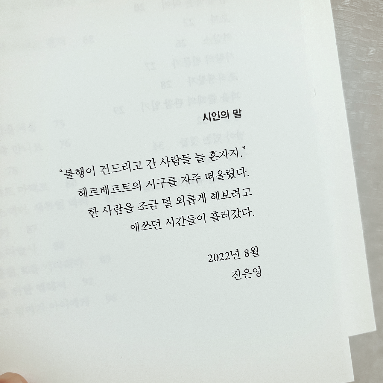 글을 쓰는 일이 언젠가 상처가 될 줄은 알고 있었다. 대학을 다닐 때는 별로 읽고 싶지 않았던 시집들을 읽는다. 끝없이 명징함을 요구하는 사람들 사이에 섞인 채 시어들 속에 잠시 몸을 숨긴다. 책장 아래에서 겨우 숨을 쉰다.
