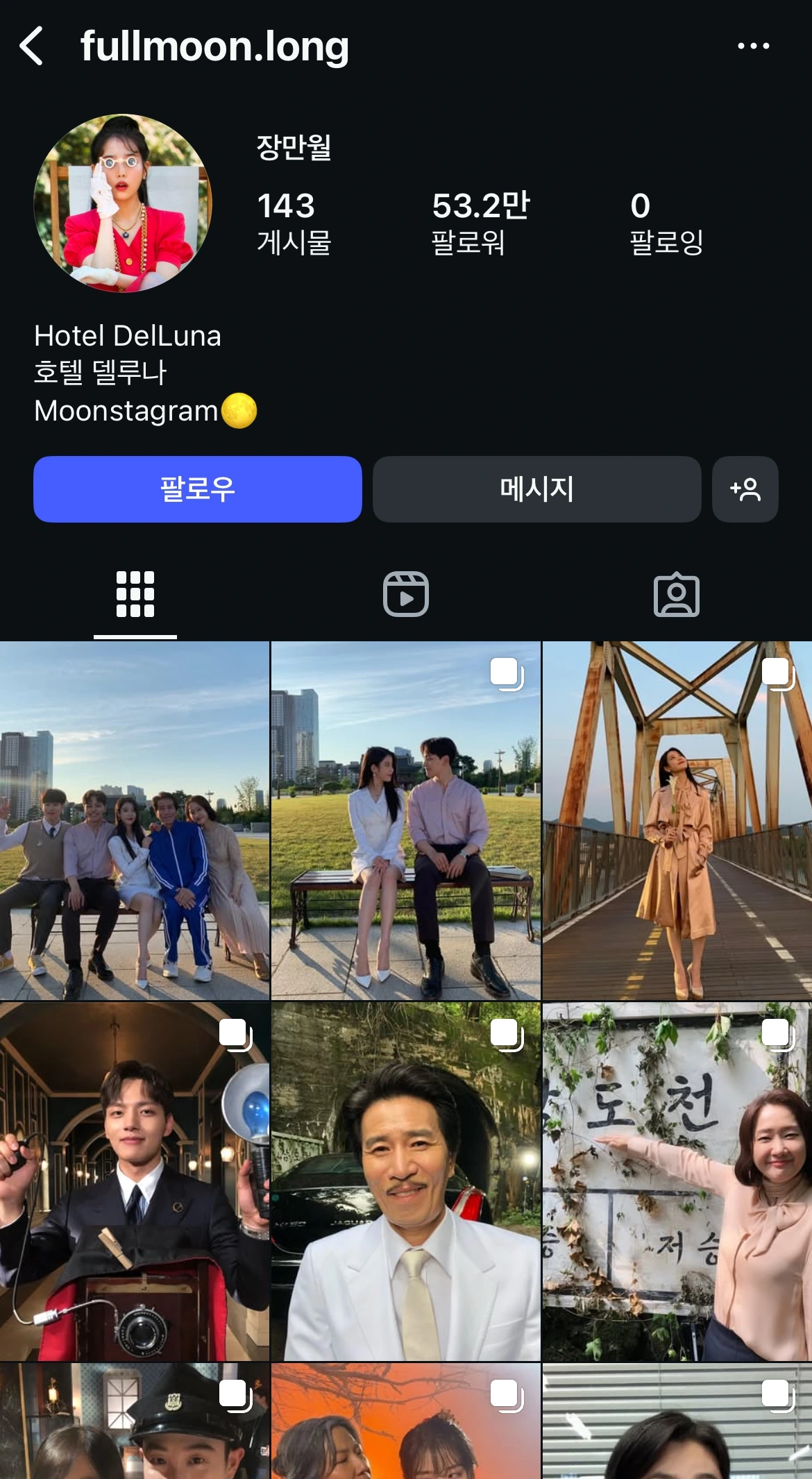 먼저 죽은 사람들만 머무는 특별한 호텔을 배경으로 한 '호텔 델루나'도 방영 기간 동안 SNS를 운영했다. 드라마 속 아이유가 맡은 장만월은 @fullmoon.long 계정을 만들어 꾸준히 SNS를 운영했다. 드라마 속의 장면이 아닌, 촬영 중 찍은 비하인드 컷으로 실제 운영 중인 호텔이 있다는 느낌과 함께 실제 이들이 함께 살아가고 있다는 느낌을 주고 있다. > https://www.instagram.com/fullmoon.long/