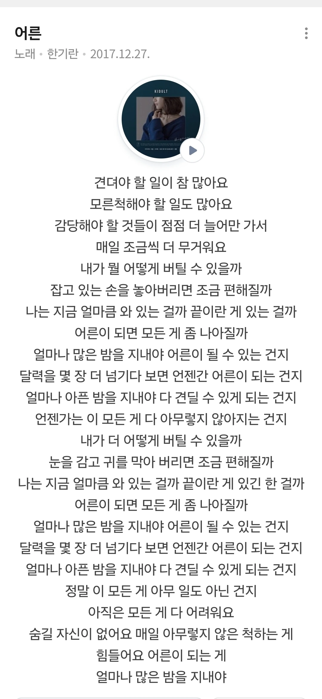 수지가 추천한 한기란의 <어른> 가사를 읽으며..