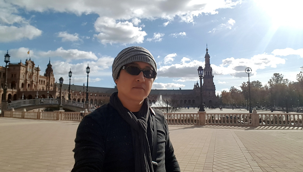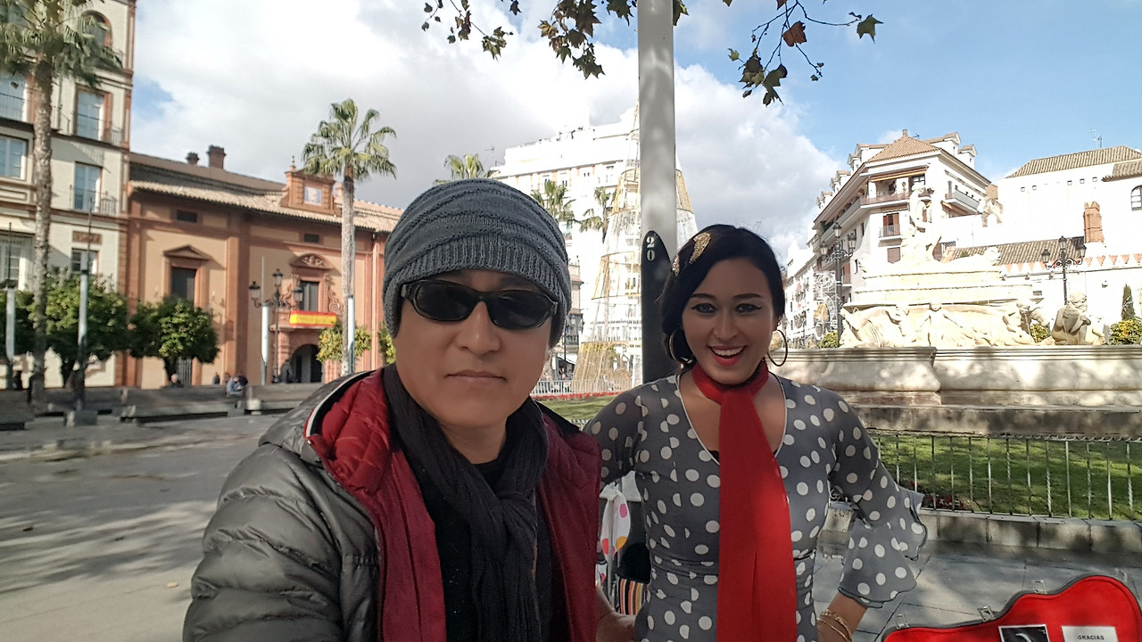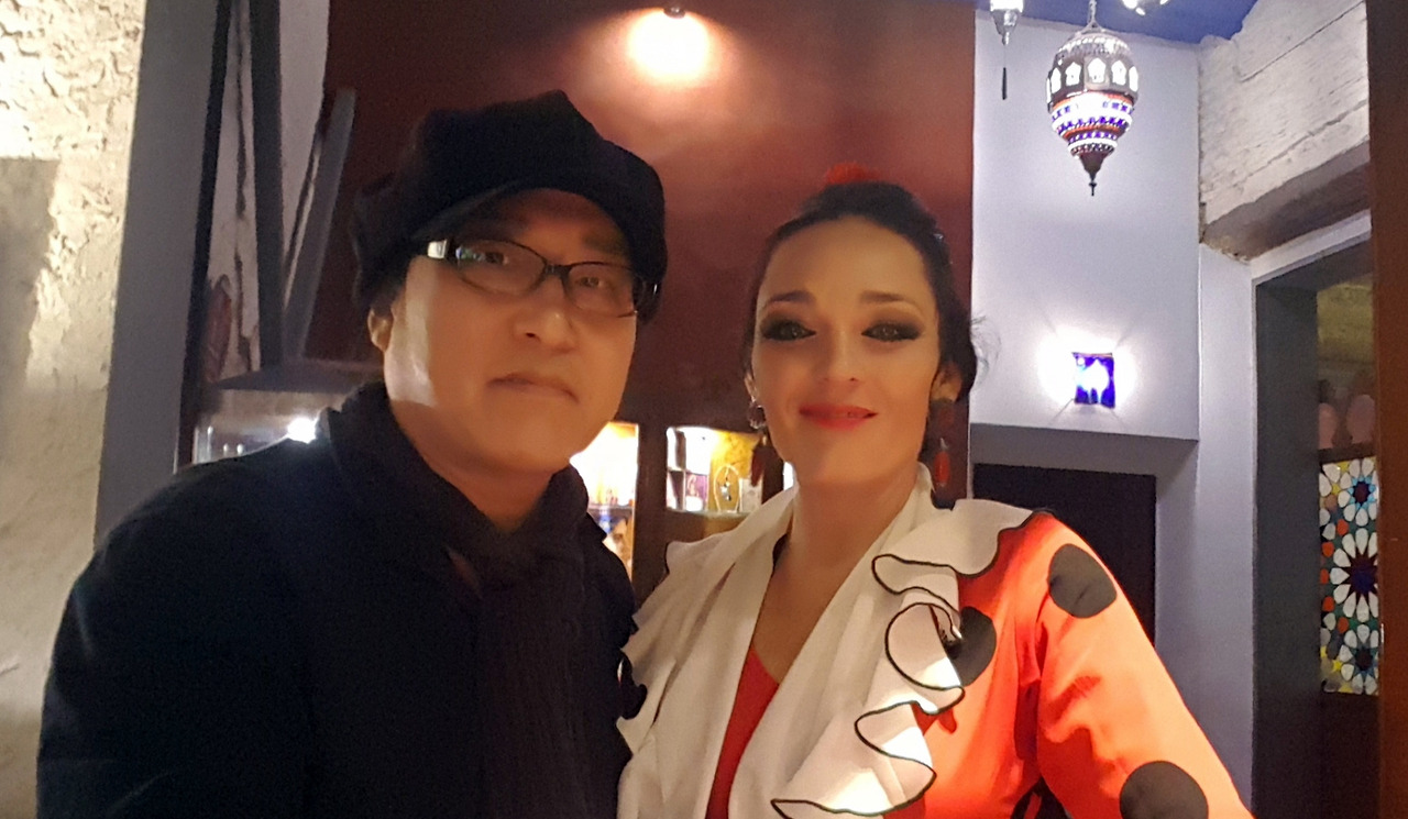 추억의 집(Casa de la Memoria). 이곳이 세비야의 정통 플라멩코 전용극장입니다. 공연장은 아주 작습니다. 작은 건물 안에 매표소가 있고 그 왼쪽으로 난 문이 공연장 입구입니다. 표를 사는 중에 웬 무대 의상 입은 어여쁜 여인이 공연 전 짬이 나서 그랬는지 매표 여직원 뒤 매표실 안에서 핸드폰 들여다보며 문자를 날리고 있습니다. 딱 봐도 심상찮은 여인. 포스가 일시불로 느껴집니다. 매표 여직원에게 물어봤습니다. 아니나 다를까 오늘 출연하는 특별 게스트로 인간문화재 급 플라멩코 댄서라고 합니다. 용기를 내어 사진을 함께 찍고 싶다고 질렀죠. 매표 여직원은 곤란한 표정을 지으며 고개를 가로저어 댑니다. 그 때, 플라멩코 여인이 내 말을 들은 모양으로 턱을 바투 세워 도도한 표정으로 나를 슥 쳐다보더니 섹시한 미소 지으며 다가와 흔쾌히 들러붙습니다. 사진 찍고 나서 이름을 물었습니다.