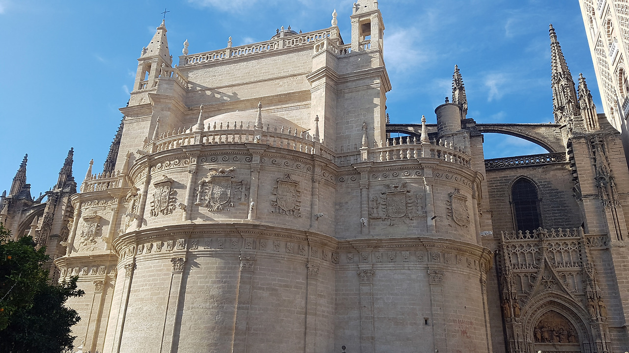 이탈리아 바티칸의 성 베드로 대성당은 르네상스 양식을 대표하고 영국 런든의 세인트폴 대성당은 네오 르네상스 양식을 대표한다면, 바로크 양식(16~18세기, 오목 볼록 타원형 장식이 특징)과 르네상스 양식(15~17세기, 돔이나 첨탑 대신 우주와의 조화 추구) 이전의 고딕 양식(12~16세기, 수직 첨탑과 스테인드글라스를 강조)을 대표하는 성당이 바로 이 세비야 대성당(Catedral de Sevilla)이라고 합니다.