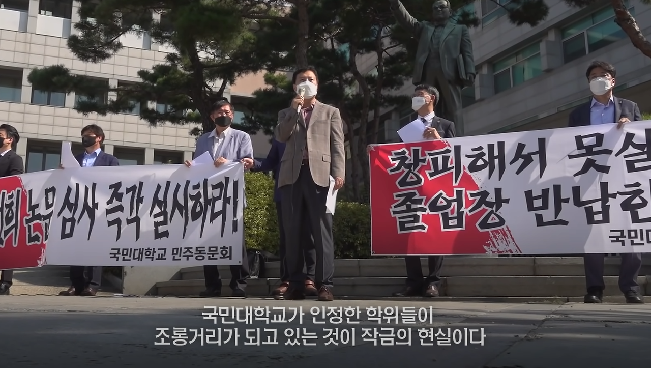 표절 논란이 따르는 김건희 논문에 문제 없다는 결론을 내린 국민대학교 측에 졸업생 2백명이 졸업장 반납을 발표하고 있다. 사진 CBS 노컷브이(유튜브) 화면 갈무리