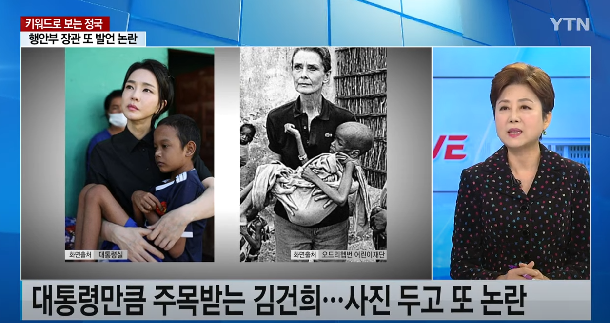 소말리아 기근 아동 구호 활동 모습의 오드리 헵번(우측)과 비교되는 사진으로 한바탕 논란이 일어났다. 사진 YTN News 화면 갈무리