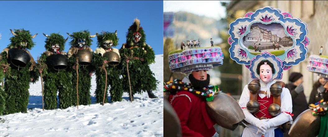질베스터클라우젠 축제에서 기괴한 가면을 쓴 모습. 여인들은 미인 가면을 쓴다. 사진 Newinzurich