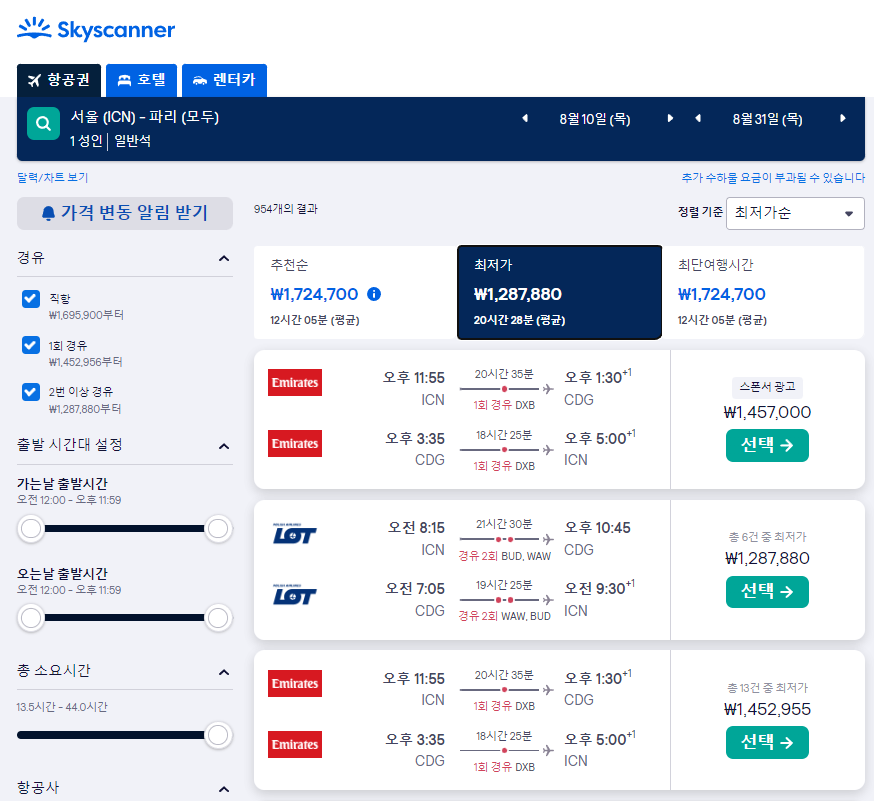 스카이스캐너 사이트로 인천~파리 왕복 최저가 항공권 찾기 예시