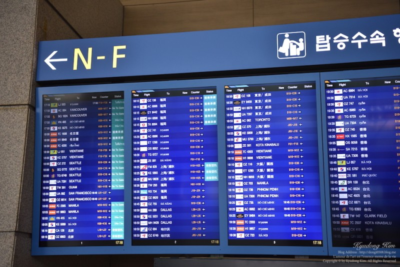 - 출국 공항에 도착하면 자신이 탈 항공기 고유번호(비행기 편명)를 확인하고 로비에 있는 항공기별 티케팅 안내 전광판을 찾는다. 안내 전광판은 여기저기에 고루 있기에 찾기 쉽다. 자신의 항공기 고유번호(예> KE5901 *대한항공 5901)로 어느 카운터(A, B, C, D...F, G등으로 구역을 나눔)에서 티켓 체크인할 수 있는지 확인하고 해당 카운터를 찾아가서 예약표를 내주면 보딩패스를 받을 수 있다.