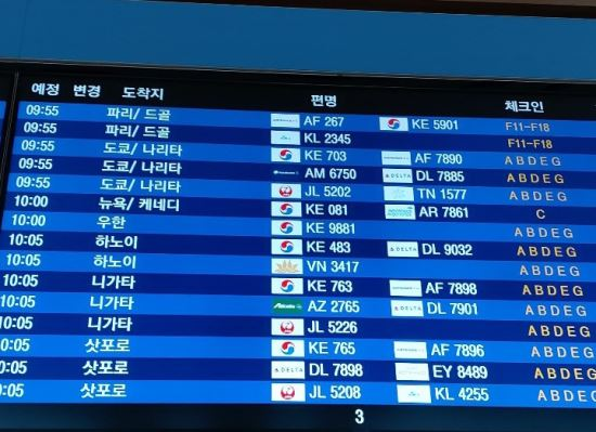 저신의 항공기 고유번호가 KE5901이면 체크인(Check in) 카운터는 F구역의 11번~18번 카운터에서 예약표 체크인 후 보딩패스를 받을 수 있다.