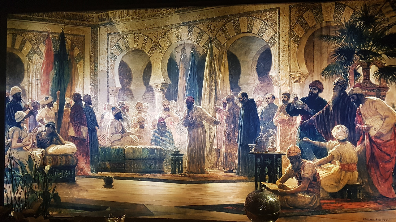 올드 타운 남쪽으로 로만 다리(Roman Bridge)가 있고 그 건너편에는 칼라오라 탑(Torre de la Calahorra)이 있어서 그곳도 들러봅니다. 탑 내부는 이 마을의 옛 모습을 설명해 주는 전시관이 있습니다. 2층 공간에는 커다란 벽화가 전시되어 있는데 화려했던 옛 이슬람 왕실 풍경으로 보입니다. 잘 그렸다 싶습니다. 또 층층 계단마다 벽을 파고 만든 자그마한 공간 안에 전시해 놓은 옛 무슬림 양식 악기들이 계단을 오르내릴 때마다 내 눈길을 사로잡습니다. 칼라오라 탑. 아주 앙증맞게 작은 크기이지만 꼼꼼하게 잘 정비되어 있는 관광 코스다 싶습니다.