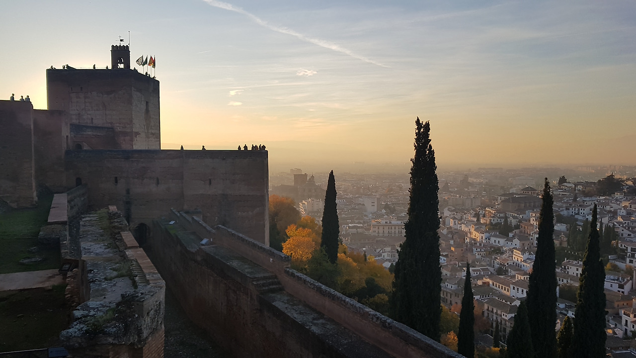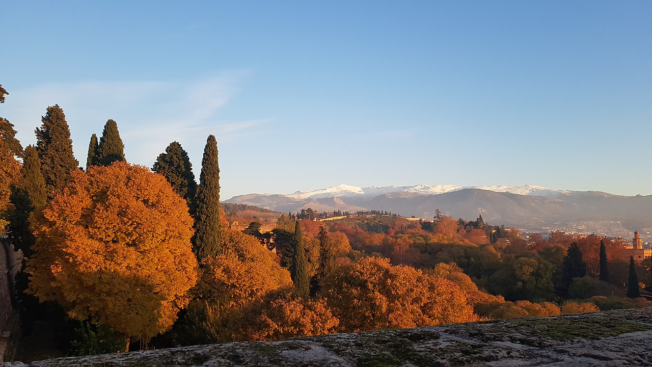 그라나다에 석양이 물드는 중에 반대편 멀리 보이는 만년설산 시에라 네바다(Sierra Nevada) 산은 특별한 자태로 나그네의 눈길을 끕니다.
