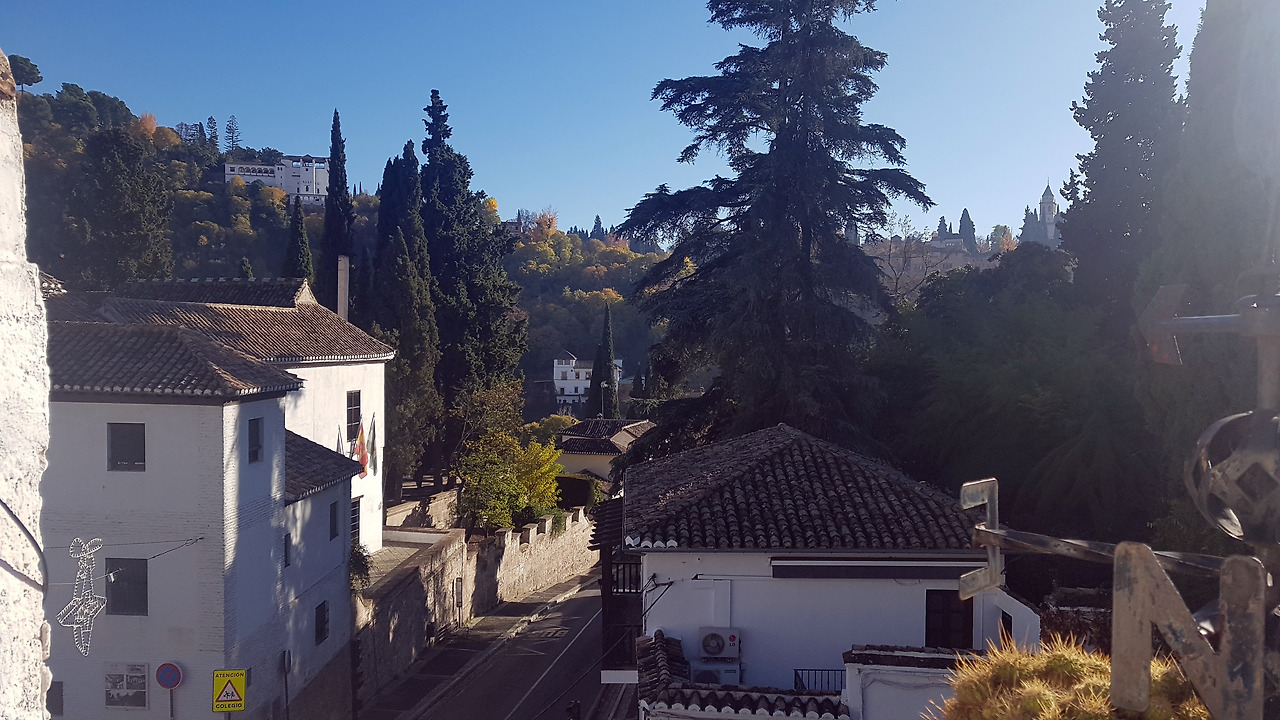 이 마을은 알함브라(Alhambra) 궁전 아래에 붙어 있습니다. 짐 정리한 후 손으로 대충 빨은 옷가지들 내다 걸려고 테라스에 올라가 보니 관망이 너무 좋습니다. 오른쪽에는 알함브라 궁전이 살짝 보이고 왼쪽에는 사크로몬테 지구가 사랑스럽게 펼쳐져 있습니다. 그냥 여기에 앉아 있어도 그라나다를 절반은 느끼겠다 싶습니다.