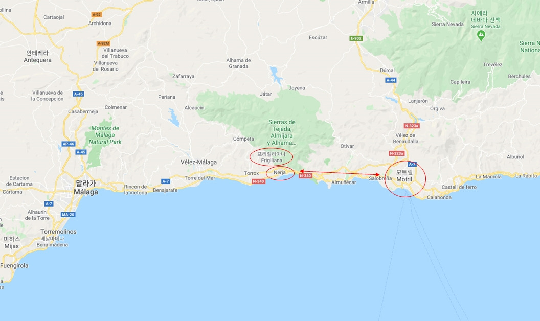 여정은 네르하에 도착하자마자 먼저 프리질리아나(Frigiliana)를 방문하는 것으로 순서를 잡았습니다. 프리질리아나는 내륙 쪽으로 5km 정도 들어가야 나오는 마을인지라 그곳을 먼저 맛보고 나서 다시 네르하로 내려와야 합니다. 그래야 저녁 식사 후 곧바로 네르하에서 버스 타고 모트릴로 돌아가기 편합니다.