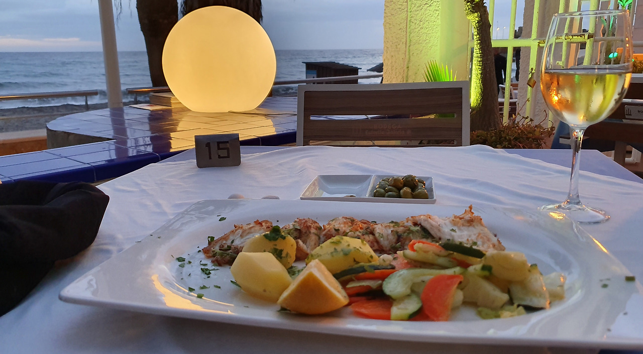 해가 지면서부터 지중해는 이제 묵직한 목소리로 물결을 일굽니다. 그 소리에 취해 하염없이 바닷가를 거닐다가 네르하의 해물 요리를 기대하며 바닷가 바로 옆에 붙어 있는 어느 레스토랑 노천 자리에 앉았습니다. 핑크 피쉬와 화이트 와인 한 잔을 주문했습니다. 가격은 13유로.