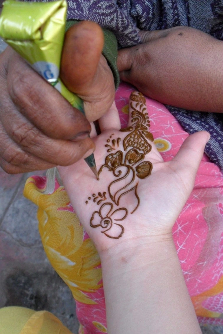 마지막 날이니까 팔뚝에 거대한 헤나를 새기고 한국에 돌아가기로 했다. 닭꼬치 맞은편에 헤나 좌판이 있다. 푸근한 인상의 할머니는 헤나를 그리고, 10대 초반으로 보이는 남자아이가 접객과 호객을 맡아한다.