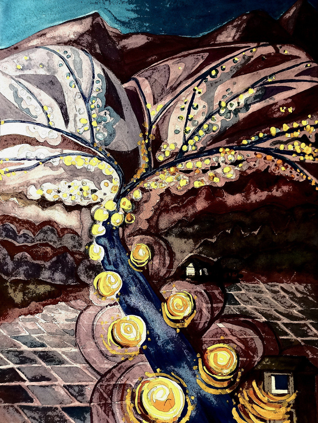 그림의 맨 위엔 어두운 하늘이 있다. 하늘과 맞닿은 먼 산은 밤의 공기에 젖어 검디검다. 그 아래 가까운 산이 있다. 흐린 실루엣으로 구분할 뿐 검은 것은 마찬가지다. 내 발치가 그림의 아래쪽이다. 널찍한 길은 산 쪽으로 향한다. 산을 향해 가지를 뻗어 올라갈수록 길은 폭을 좁힌다. 전등을 열매처럼 달아맨 길들이 산을 오른다. 오를수록 빛의 반경이 줄어들다가 산꼭대기쯤에서 두어 개의 점으로 반짝인다. 어느새 여러 갈래로 뻗은 길은 골과 산등성이를 넘어 사라진다.