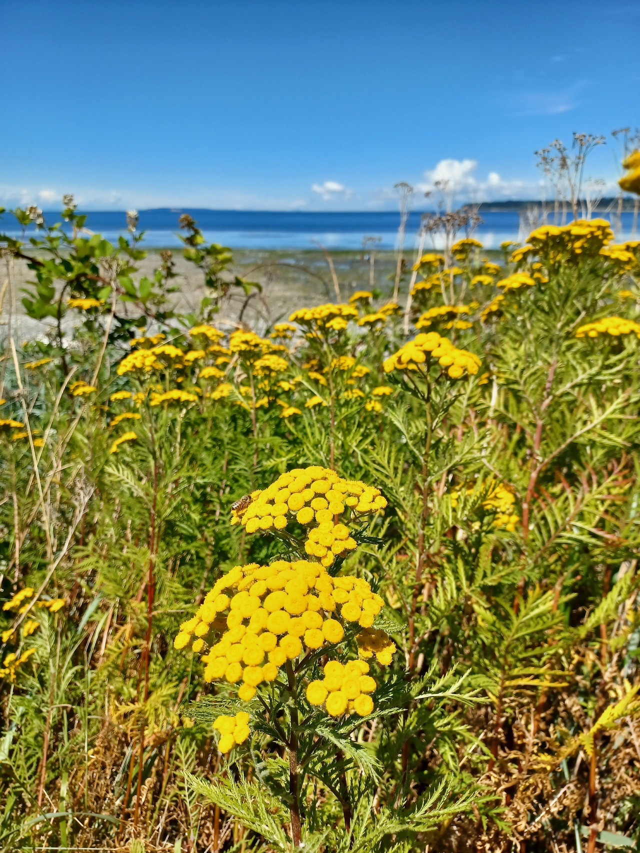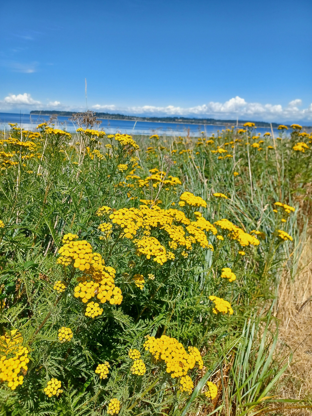 여름 바닷가엔 노란 단추 모양의 탄지(tansy) 꽃이 줄지어 피었다. 탄지와 먼 바다를 등지고 찰칵 사진 한 장을 찍었다. 꽃이 너무 예쁘게 웃어서 내 미소가 어쩐지 멋쩍었다. 동그라미를 매단 꽃송이들이 자꾸 눈을 잡아당겼다. 탄지가 바라보는 바다는 어떤 풍경일까? 무릎을 숙여 꽃에 얼굴을 대고 키를 낮추니, 폭을 줄인 남색 가로줄 바다가 잔잔히 흔들렸다. 멀리 물가에서 사람들이 간간이 꼼지락거리고 그들의 이야기가 웅얼웅얼 바람에 실려 왔다. 내 눈이 바라보는 바다는 식상하니, 오늘은 네가 말을 하렴.
