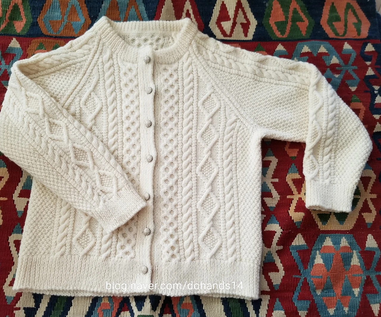 한림 수직 카디간은 한 겨울 외투로 입어도 될 정도로 두툼한 편이었다. 그러나 이번 작품은 말 그대로 카디간이다. 사진에선 잘 보이지 않지만 셀틱(북유럽)스런 무늬에 철제 단추를 사용했다. 한림 수직 카디간은 코바늘로 뜬 싸개 단추를 사용했었다. 카디간에 애런 무늬는 한림 수직 그대로다.