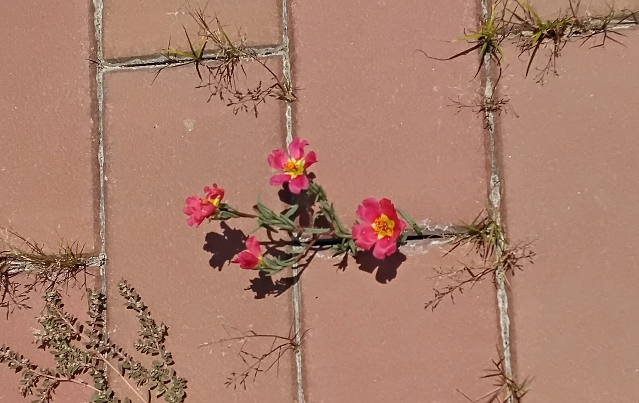 -비오는 날 토요일 북카페 테라스 블럭사이에 핀 한 송이 채송화를 보면서