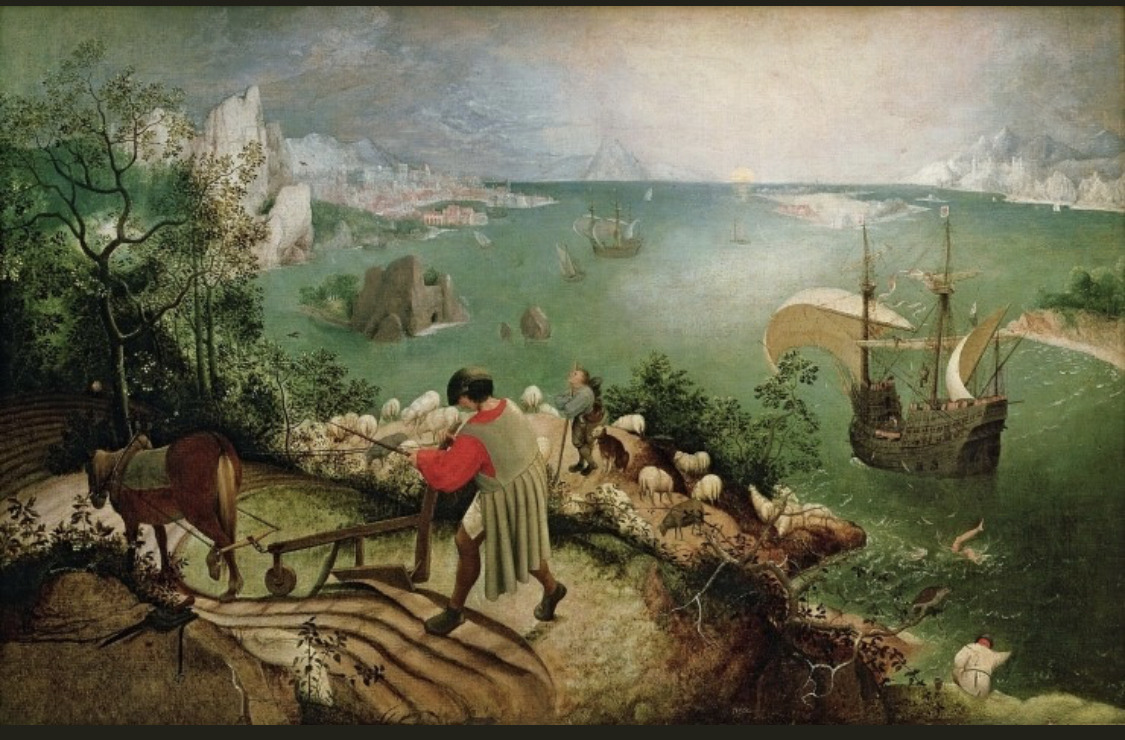 브뤼겔의 그림 속에서 이카루스는 거의 숨은 그림 찾기다. 일상을 계속 사는 보통 사람들, 어디 부두의 풍경화 같은데, 제목은 이카루스의 추락이다. 잘 찾아보면 거대한 망망대해 구석에 거꾸로 처박혀 허우적대는 다리가 물 위로 조그맣게 보인다. 깃털도 날린다. 제목은 분명 이카루스의 추락인데 그림에서 그가 차지하는 비중은 매우 미미하다. 이카루스가 주인공 맞나?