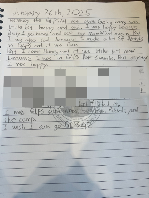 '마침내 졸업하여 집에 왔는데, 기쁘기도 하고 슬프기도 하다. 엄마 아빠를 만난 것은 좋은데, 캠프에서 사귄 좋은 친구들, 수업, 선생님이 좀 그립다. 다음에 또 가고 싶다.'