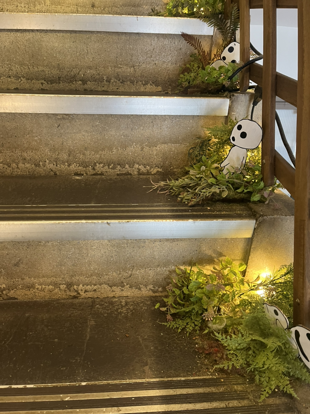 오스 상점가로 온 이유 두 번째 이유는 지브리 테마카페입니다. 카페 이름은 오스모노리 카페 코다마. 제가 꼭 가보고 싶었기에, 이번 유람에서 유일하게 예약해 둔 식당 겸 카페였습니다. 가파른 계단을 3층이나 올라가야 했지만. 나고야에 오면서 지브리 파크를 가지 못하는 아쉬움을 충분히 달래준 곳입니다. 지브리 파크를 이 어정쩡한 일행과 걸으면서 인당 20만 원 넘는 입장료를 내는 것보다는 훨씬 만족스러울 것 같았어요.