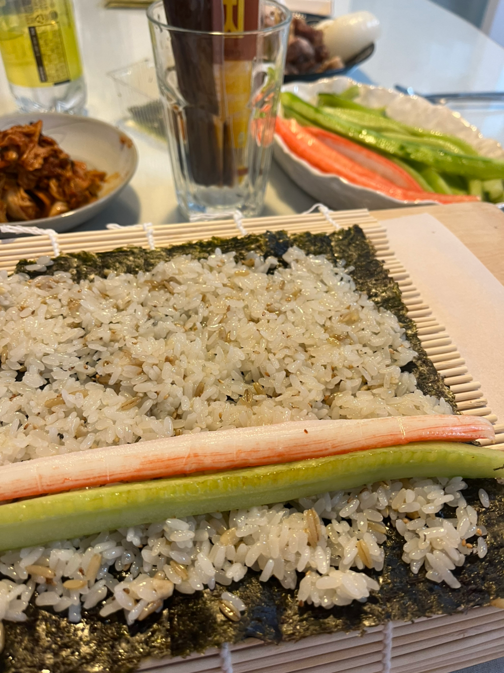 프라이팬에 열이 들어온 상태에서 계속 오이를 이리저리 계속 움직이니까, 어느 정도 시간이 흐른 후 전부 프라이팬 속으로 쏙쏙 들어가는 거예요. 열받은 오이가 프라이팬 속에서 말랑말랑해진 것인지, 휘어지더라고요. 이게 뭐라고 피식피식 웃음이 났습니다. 식탁에 온 가족 다 같이 앉아 김밥도 야무지게 말아먹었습니다.